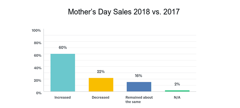 Mother’s Day 2018 will go down in the books as a strong holiday for many florists: 60 percent of retail florist respondents to a Society of American Florists’ post-holiday survey reported a sales increase. The same percentage reported an increase last year. Small shops ($150,000 or less in annual sales), large operations ($1 million-plus in annual sales) and florists in suburban locations reported an especially strong holiday this year.