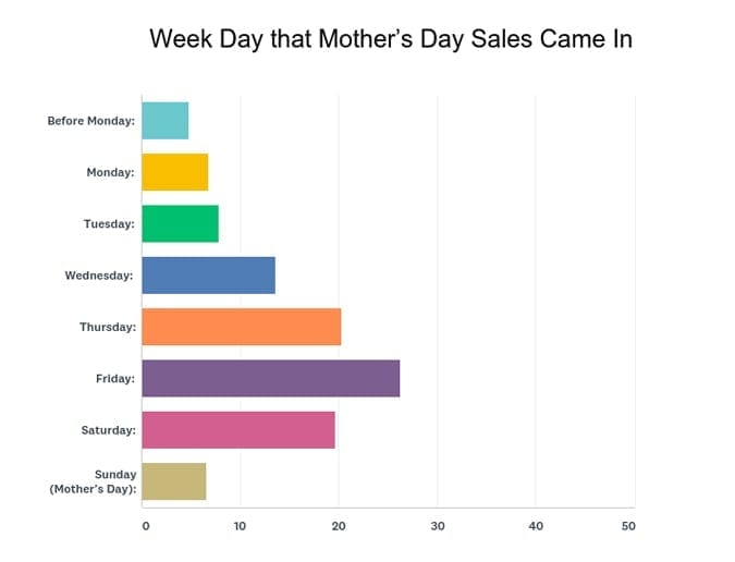 As with Valentine’s Day, respondents noted a time crunch — with many consumers waiting until the end of the week to place orders, though the distribution of sales by day of the week this year tracks closely with returns from last year’s survey.