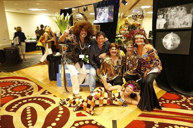 The Sylvia Cup, the country’s longest running live floral design competition, was even livelier than usual this year. Hundreds of spectators, including industry professionals and members of the public, dropped into a hotel ballroom turned design room/dance club (complete with disco balls, a DJ, and a few costumed announcers in gold lame and bell bottoms), on Aug. 16 to watch 25 designers compete in the Studio 54 Revisited themed event during the final day of SAF Marco Island 2014, the Society of American Florists 130th Annual Convention.